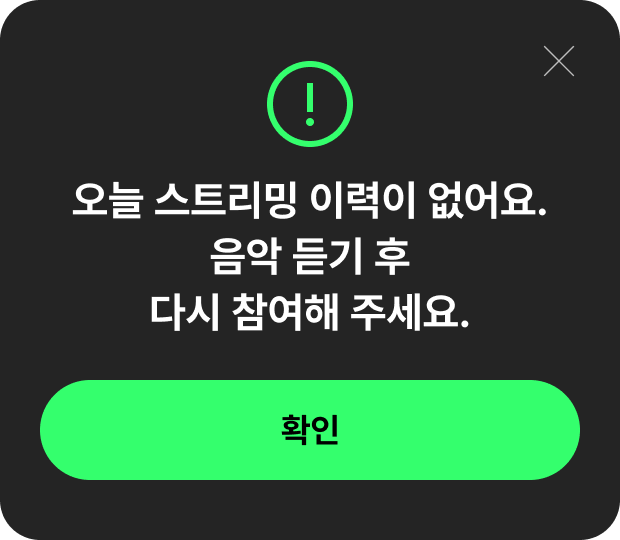- [음악서랍>최근들은] 목록에서 곡을 삭제할 경우, 본 이벤트에서 확인하는 스트리밍 이력에서 제외되어 미션 완료로 인정되지 않습니다.